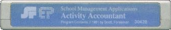 This is the back edge (label edge) of the Scott Foresman software title Activity Accountant made for the TI-99/4A home computer system.