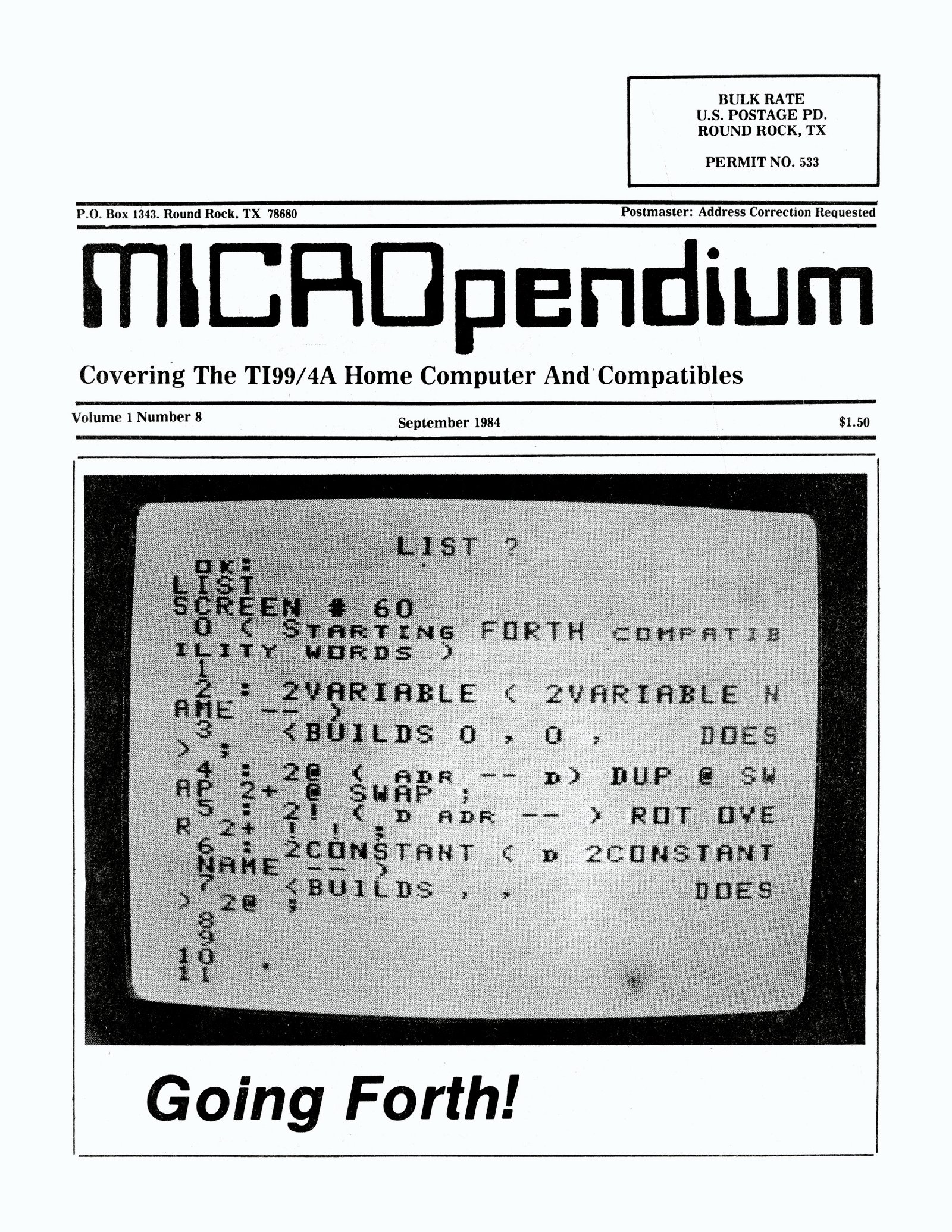 This is the front cover for Micropendium Volume 1 Number 8, September 1984.