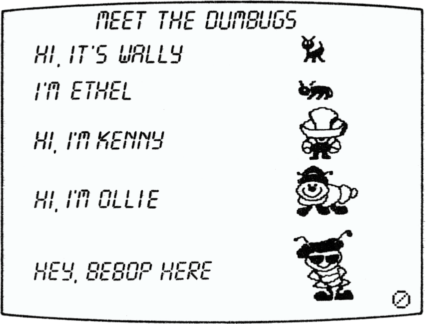 This screen lets the player meet the different Dumbugs in the TI-99/4A video game I'm Hiding.