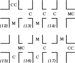 The procedure starts like a four-way intersection move (12). The cats turn into the side passages (13). In a double cloverleaf, the mouse enters the longer passage after a cat enters it (14}. When the other cat goes into the mouse's original passage (15), the mouse scampers to the passage the cats came from ( 16). This places both cats in the longer side passage (17). If you wish to go down the longer side passage, the maneuver is reversed, step-by-step, to allow both cats to leave from their original entrance (12).
