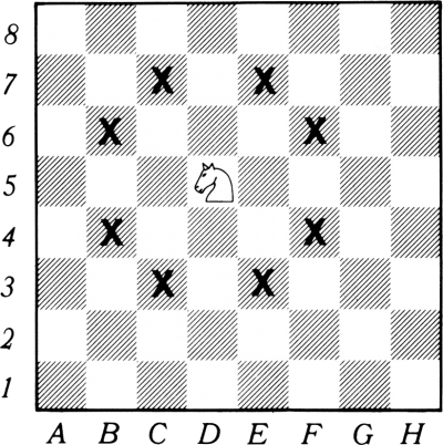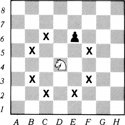 For example, the white knight is "attacking" squares C2, B3, BS, C6, E6, FS, F3 and E2 but can only capture the black pawn in square E6. (Note: The black pawn is attacking two squares - D5 and FS, but no captures are available. If the white knight were to move to square F5, it could then be captured by the black pawn.)