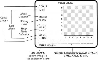 Two people can use the Video Chess module simply as a chess set and board for playing a game between themselves. When this option is chosen, the computer will set the clocks at zero and start White's clock running. When White enters a move, the white clock stops and the black one starts, and vice versa. Play will then follow all normal rules with the computer moving the pieces, checking for legal moves, etc., until game completion. If during the game, one player needs to leave the game, play can continue by pressing SHIFT M and turning over one of the positions to the computer.
