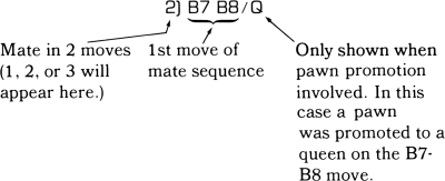 - If no mates are found, the message NO MATES appears. If more mates are possible than can be shown on one screen, then PRESS ENTER FOR MORE SOLUTIONS is shown. After all have been listed, the message NO MORE MATES appears at the end of this list.
