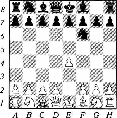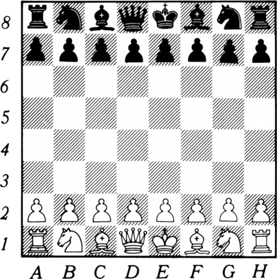 The opposing armies are made up of 32 pieces, 16 white and 16 black. On your color screen the white pieces appear as white or blue and the black ones as black. At the start of the game, these armies face each other on an 8 x 8 board, as shown.