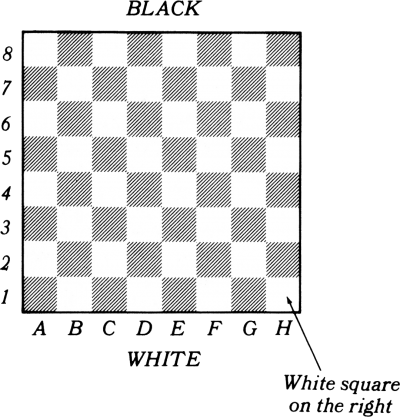 The battlefield is an 8 X 8 board placed so that each player has a white square in his right hand corner. When using the Video Chess module, the white squares are colored white and the black squares are light blue.
