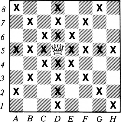 The queen is the most powerful piece on the board, and after the king it is the most valuable. If you lose your queen without capturing an opponent's piece, you will almost always lose the game. The queen moves horizontally, vertically or diagonally, across as many empty squares as the player wishes.