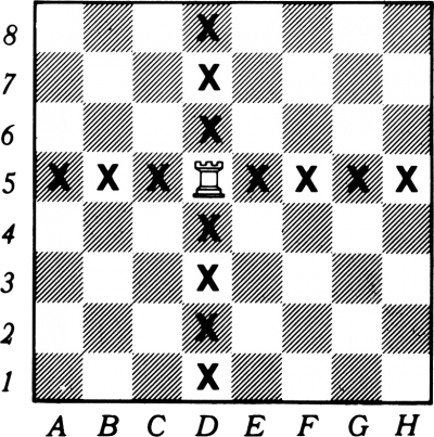 ), sometimes called castles. At the start of the game, White's rooks are on A1 and H1, Black's rooks are on A8 and H8. The rook moves horizontally or vertically, across any number of empty squares. Note that the queen combines the moves of the rook and the bishop - this is why the queen is so very powerful and so valuable.
