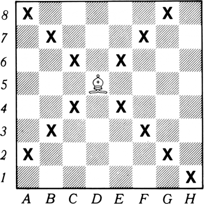 ). At the start of the game White's bishops are on C1 and F1, Black's on C8 and F8. The bishops move only along the diagonals, but like the queen they can cross as many empty squares as the player wishes.