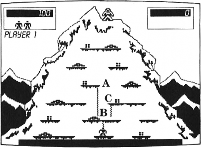 Bigfoot, meanwhile, chucks boulders at the player as he/she attempts to scale the mountain. If the player attaches his/her rope too close to the edge of a platform, it leaves him/her more vulnerable to the rocks hurled by the Bigfoot. Throwing ropes closer to the center of platforms is a protective move. Birds, during the later levels of the game, fly through the screen and snag the climber's ropes which proves fatal if climbing one at the time.