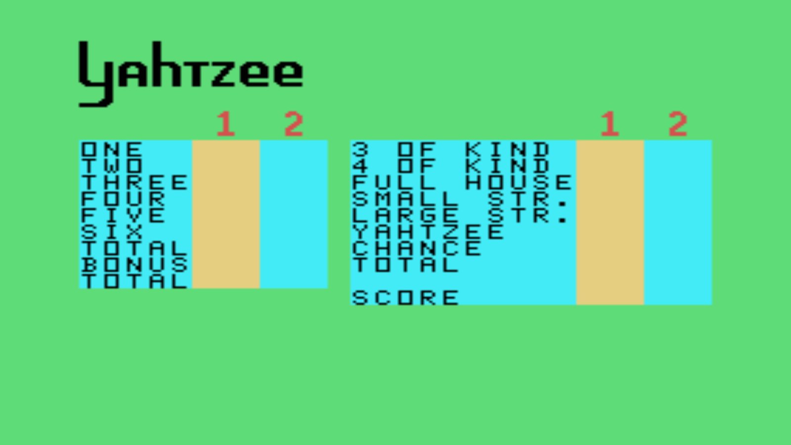 | current | 13:06, 29 September 2020 | 1,920 × 1,080 (183 KB) | Amycjgrace (talk | contribs) | This is the main scoreboard screen from the TI-99 video game Yahtzee produced by Milton Bradley. |